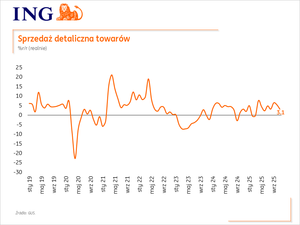 Wzrost sprzedaży detalicznej był w zasadzie zgodny z naszymi oczekiwaniami, ale podobnie jak listopadowe dane z przemysłu i budownictwa nie sprostał oczekiwaniom rynkowym, które były bardziej optymistyczne co do skali wzrostu. Nie zmienia to faktu, że handel pozostaje w trendzie wzrostowym, a konsumpcja będzie w 4kw25 ponownie głównym źródłem wzrostu PKB. W 2026 liczymy na większe wsparcie ze strony inwestycji. Przed nami duża skala napływu środków z budżetu Unii Europejskiej (EU) oraz zakończenie realizacji Krajowego Planu Odbudowy (KPO). W przyszłym roku spodziewamy się solidnego wzrostu inwestycji, chociaż wzrost prawdopodobnie nie dobije do dwucyfrowym poziomów. Wzrost PKB powinien wynieść ok. 3,7%, przy wzroście konsumpcji prywatnej o 3,4% i inwestycji o 8,2%, a Polska pozostanie liderem wzrostu w regionie i całej UE.