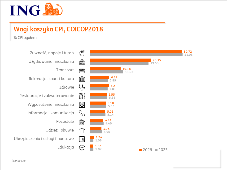 Poznaliśmy także nowe wagi koszyka inflacyjnego wg COICOP2018. Największy wzrost wagi nastąpił w przypadku kosztów związanych z użytkowaniem mieszkania i nośnikami energii - do 20,35% w 2026 z 19,53% w 2025. Mniejszy udział w koszyku w tym roku mają natomiast alkohol i tytoń (4,81% vs. 5,19%) oraz wydatki związane z transportem (10,18% vs 11,07%). W 2026 zmiana wag nie wpłynęła istotnie na zmianę głównego wskaźnika inflacji.